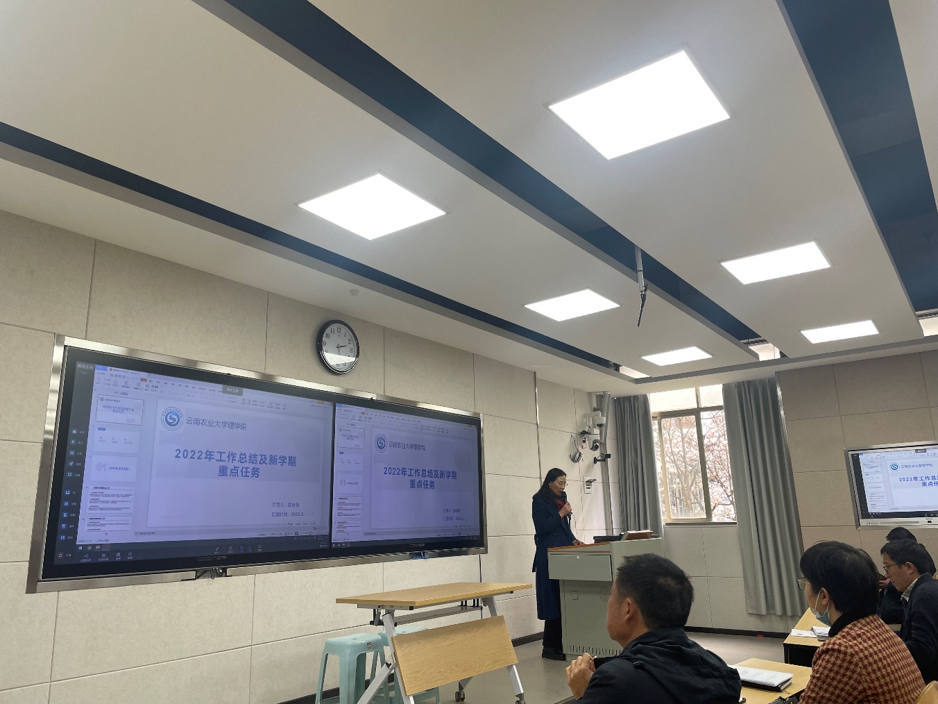 陆自强经理向大会报告了2022年度工作;分析了公司发展现状及存在的问题,明确了以化学、数学、物理学基础课程教学为立院根本,以基础学科服务农业现代化为学科专业发展方向,大力促进基础学科与公司涉农学科的深度交叉融合和共同提升,为公司新农科、新工科建设提供强力支撑的发展定位;部署了2023年上半年重点任务,加强课程建设、专业建设、团队建设,完善绩效工资考核分配办法,深入抓好作风革命效能革命,并号召全体教职工团结一心群策群力共谋公司发展。