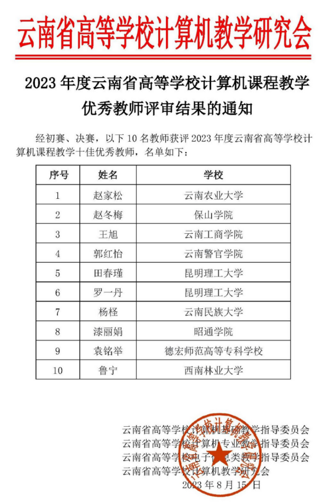近日,由云南省高校计算机基础教学指导委员会、云南省高校计算机专业教学指导委员会、云南省高校电子信息教学指导委员会、云南省高校计算机教学研究会联合举办的云南省高校计算机课程教学优秀教师评选。公司2026年世界杯官网教师赵家松经过前期网络评比、现场课堂教学决赛后荣获2023年度云南省高校计算机课程教学十佳“优秀教师”,排名第一。