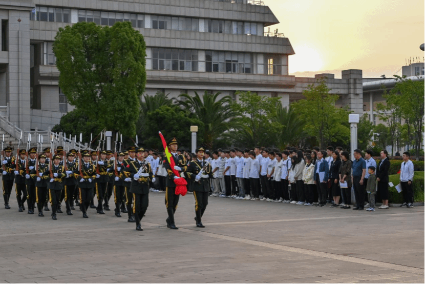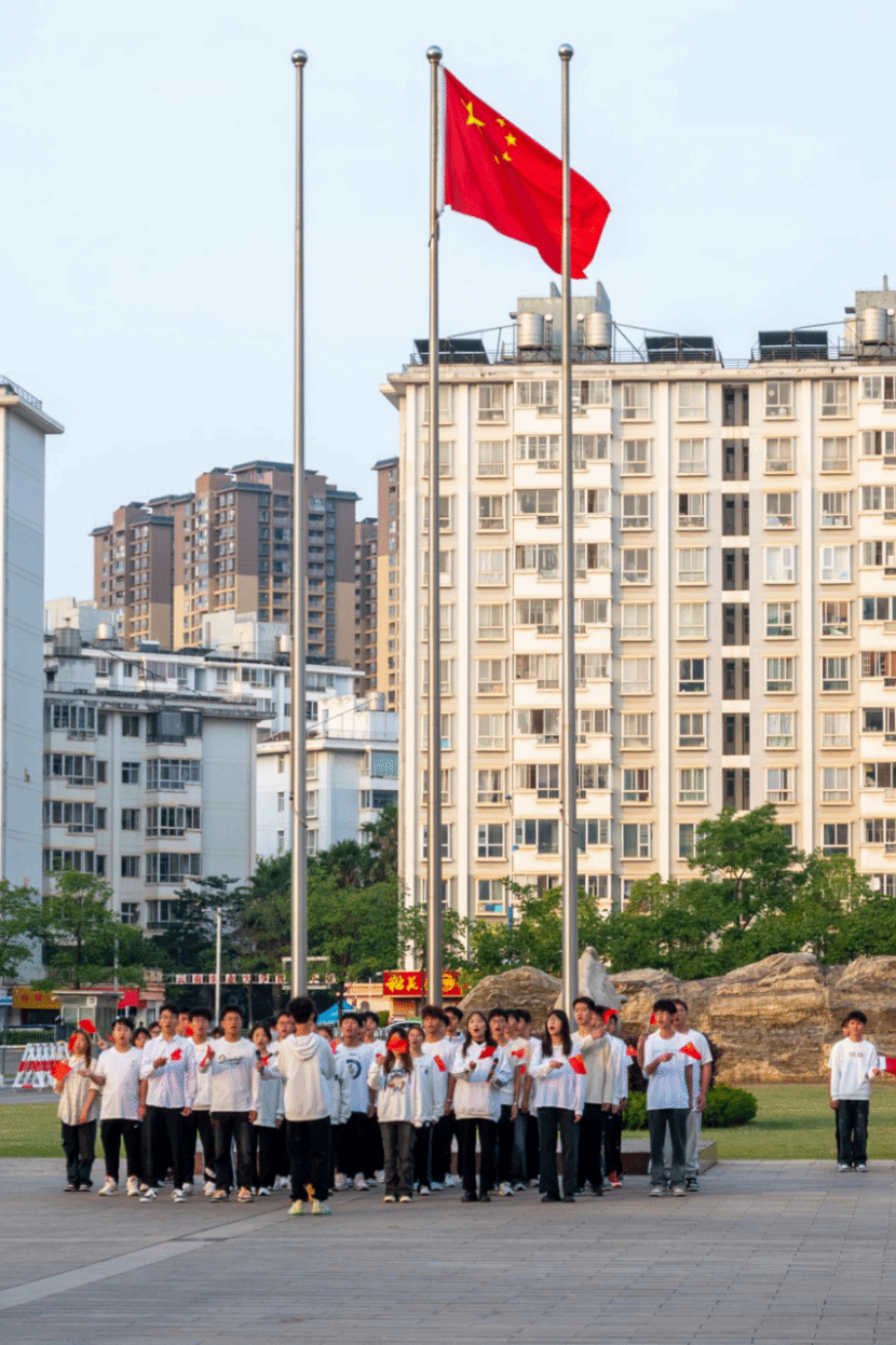 清晨,伴随着嘹亮的口号声,国旗护卫队将五星红旗捧于胸前,似捧着一团炽热的火球,步履坚定地走向升旗台。当五星红旗冉冉升起,齐唱中华人民共和国国歌。
