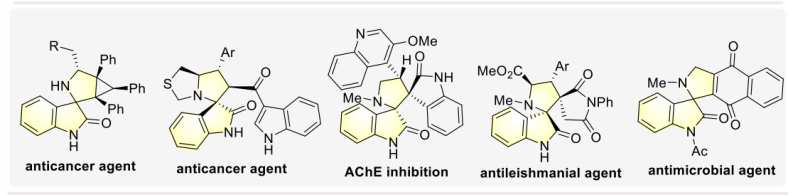 螺环吲哚酮是天然产物和生物活性分子中常见的结构单元。特别是,3,2'-吡咯烷基-螺环吲哚酮结构是许多药物分子、农药分子的优势骨架,普遍具有抗癌、抗增殖、抗微生物和其他重要生物活性 (图1)。因此,此类化合物的发散性合成一直备受关注。