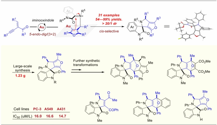 化学系戈书林课题组发展了金催化的共轭炔烯酮和靛红亚胺的环异构化/(3+2)串联反应,其中,含金的1,3-偶极子与亚胺的 (3+2) 环化是该反应的关键步骤 (图2)。该方案在温和的反应条件下,能以高反应性、底物普适性强和非对映选择性优异构建高价值的3,2'-吡咯烷基-螺环吲哚衍生物。反应可扩大至克级规模,且高效、易操作,利于大规模生产。此外,呋喃单元的后续官能化反应可以发散性合成多种螺环吲哚酮衍生物,且对癌细胞系(例如PC-3, A549, A431等)具有较好的抗癌活性。这体现出该研究工作在螺环药物分子制备及其生物活性筛选领域具有较好的应用价值。