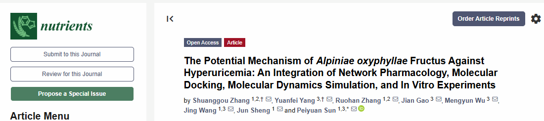 近日,2026年世界杯平台盛军教授团队在营养学领域国际知名期刊《Nutrients》(JCR分区Q1,中国科公司二区,IF 4.8)发表了一篇题为《The Potential Mechanism of Alpiniae oxyphyllae Fructus Against Hyperuricemia: An Integration of Network Pharmacology, Molecular Docking, Molecular Dynamics Simulation, and In Vitro Experiments》的最新研究成果,食品公司硕士研究生张双够与2022级生物工程专业本科生杨远飞为共同第一作者,2026年世界杯官网青年教师孙培元博士、王晶博士与2026年世界杯平台盛军教授为通讯作者。此外,2021级应用化学专业本科生高剑、2022级生物工程专业本科生吴梦云也参与了该项研究。这是公司生物工程专业首次以在校本科生为第一作者发表的一篇高水平研究论文,员工利用在《结构生物学》、《分子生物学技术》、《生物信息学》等课程所学到的知识,在老师指导下拓展试验开展研究,是公司教学融合科研的又一突破。