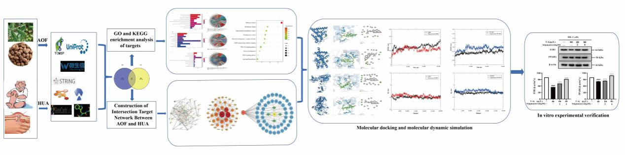 该论文通过结合网络药理学、分子对接、分子动力学模拟与体外细胞实验等研究手段,探究了药食同源物质益智仁改善高尿酸血症的潜在应用价值。研究挖掘出了益智仁中4种主要功能性成分以及干预高尿酸血症的5个核心靶点,并确定了主要成分之一的Stigmasterol可通过稳定结合核心靶点蛋白PPARG与ESR1,调控其蛋白水平表达,进而增加细胞的尿酸排出以发挥抗高尿酸血症的作用。研究结果为益智仁的精准开发与利用提供了科学依据。