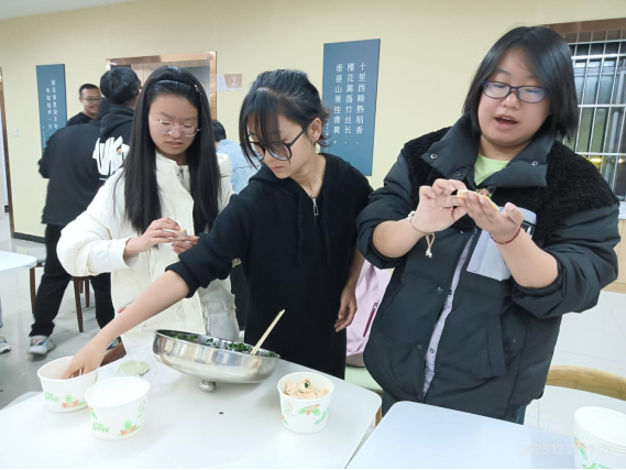 活动伊始,同学们迅速分组分工,捋起衣袖搓面球、擀面皮、包饺子。有的用料十足,包出的饺子个大肚儿圆,彰显出北方的大气与豪爽;有的大小均匀,包出的饺子精致美观,呈现出南方的清秀与灵动。元宝饺子、月牙饺子、大头娃娃饺子……大家欢乐地交流,认真地操作,时而探讨心得,时而过招切磋。看着自己包的饺子,大家的脸上都洋溢着兴奋与自豪,吃着热气腾腾的饺子一边聊着天,气氛非常欢快活跃,为这个寒冷的冬季带来了满满的温情。