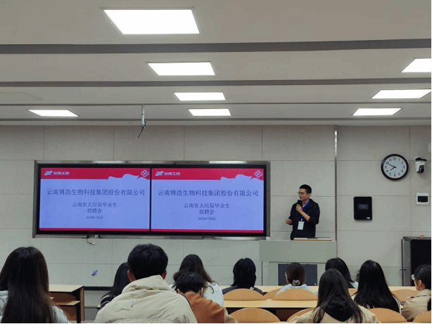 交流洽谈结束后,博浩生物在养正楼B102教室举办2026届毕业生专场招聘宣讲会。公司人力资源部主管黄亮担任主讲,通过PPT展示、案例讲解等形式,详细介绍了企业背景、岗位需求、薪酬福利体系及清晰的职业发展路径,为应届毕业生提供了优质、精准的就业选择。宣讲会现场互动积极,有效搭建了校企人才对接桥梁,助力毕业生实现高质量就业。